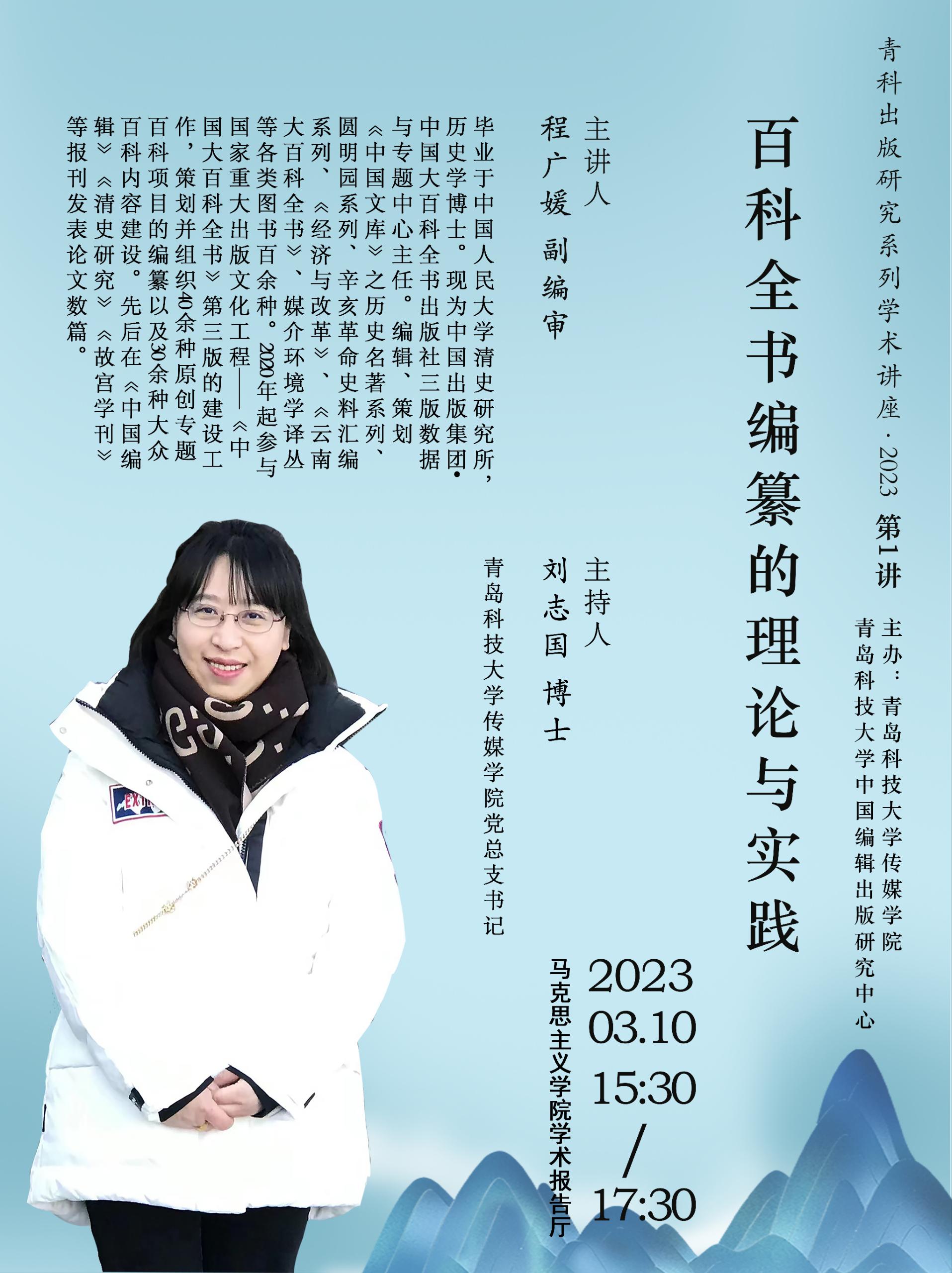 3月10日下午,伟德BV官网在马克思主义公司学术报告厅举办百科全书的编纂理论与实践主题讲座。此次讲座是公司出版研究系列学术讲座2023年第一讲,由中国出版集团中国大百科全书出版社三版数据与专题中心主任程广媛主讲。