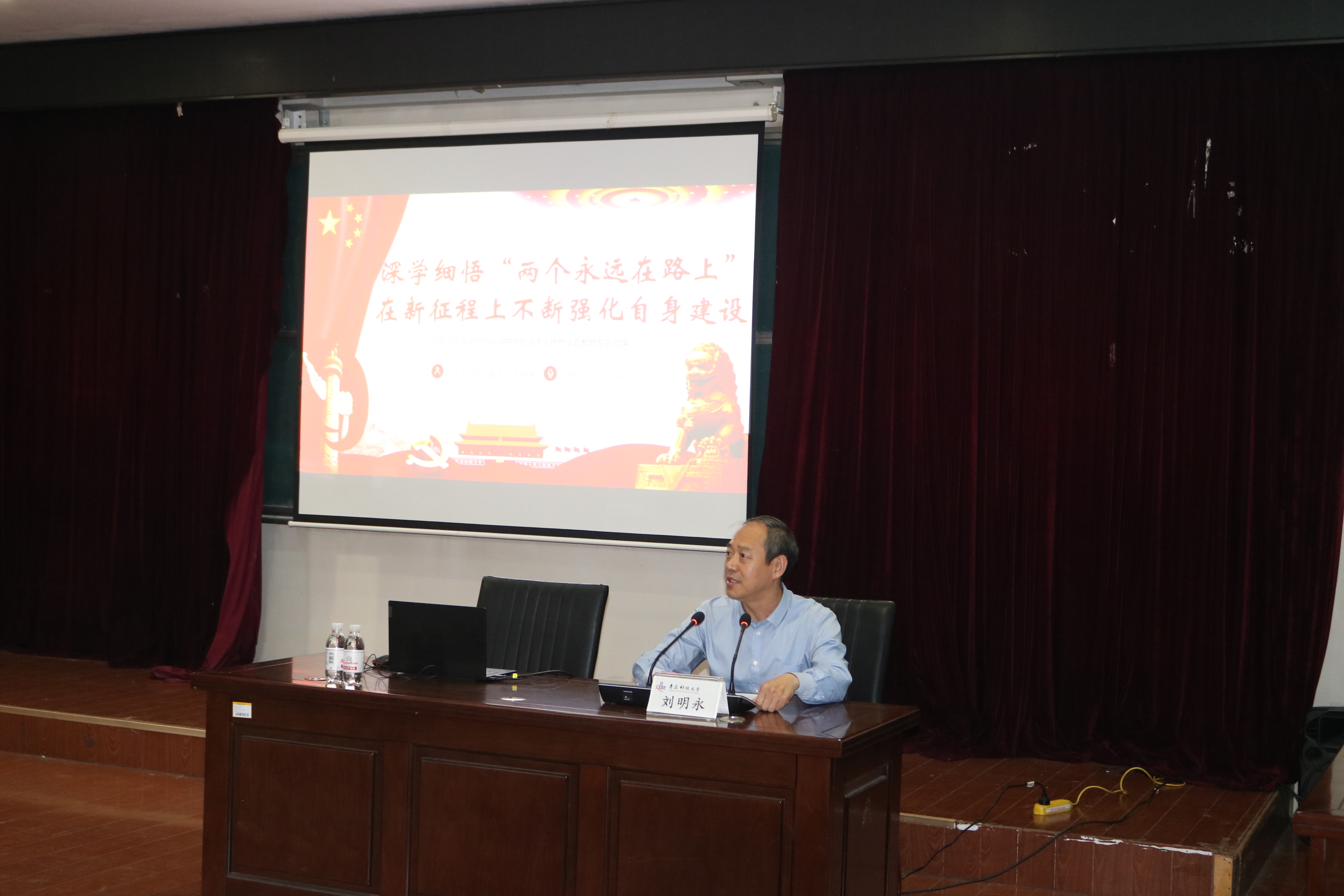 刘明永以“深学细悟‘两个永远在路上’,在新征程上不断强化自身建设”为主题,结合自身多年工作经历和身边案例,详细讲解了全面从严治党的历史背景、现实要求和主要内容,并就学习贯彻主题教育和党的二十大精神分享了认识体会。他指出,两个“永远在路上”,既体现了全面从严治党任重道远,也表明了以习近平同志为核心的党中央推进新时代党的建设新的伟大工程的信心、决心与恒心。通过深学、细悟、笃行习近平新时代中国特色社会主义思想和党的二十大精神,深刻领会思想伟力,凝心铸魂筑牢根本,做到在学习中思考、在思考中践行、在践行中提升。
