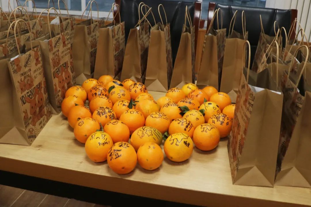 功不唐捐,玉汝于成。伟德BV官网团委老师和同学们亲手准备有趣又暖心的小礼物——“好运脐”,甘甜圆润的橙子被文字和图案赋予了新的含义,寓意旗开得胜,马到成功。绘制完毕,同学们设计摆出“上岸”“加油”和爱心形状,带有祝福的橙子为考研学子加油助威。除此以外,礼物袋里还有代表“你最棒”的棒棒糖和“好运旺旺”的旺旺小小酥给考生加油鼓劲。
