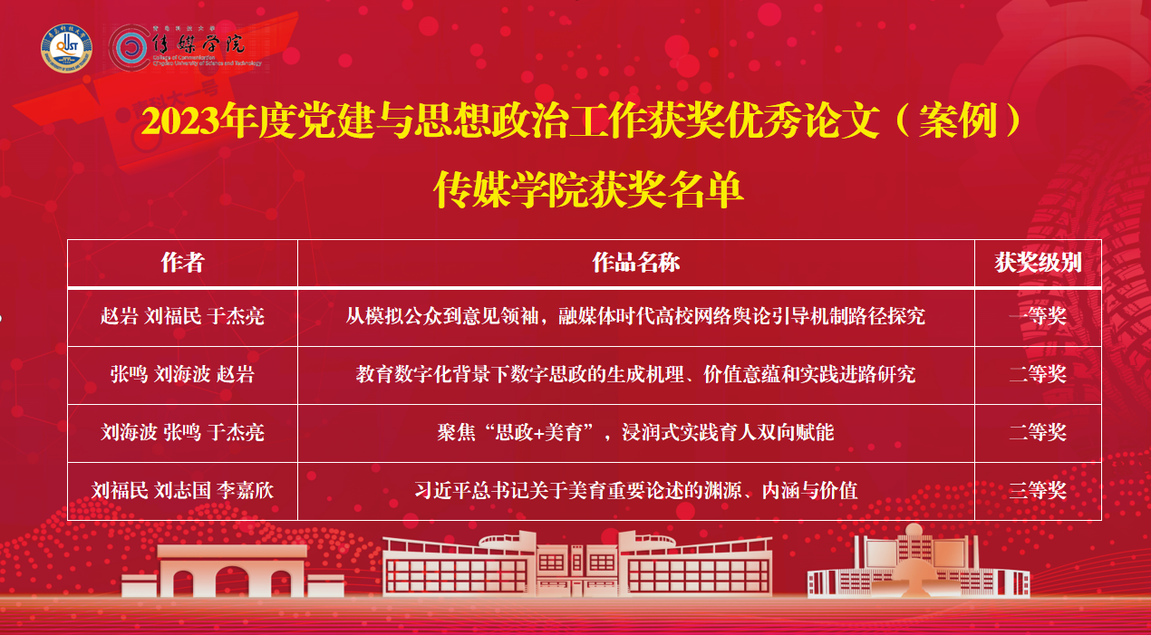 其中,由赵岩、刘福民、于杰亮撰写的论文《从模拟公众到意见领袖,融媒体时代高校网络舆论引导机制路径探究》获一等奖,张鸣、刘海波、赵岩撰写的论文《教育数字化背景下数字思政的生成机理、价值意蕴和实践进路研究》,刘海波、张鸣、于杰亮撰写的案例《聚焦“思政+美育”,浸润式实践育人双向赋能》获二等奖,刘福民、刘志国、李嘉欣撰写的论文《习近平总书记关于美育重要论述的渊源、内涵与价值》获三等奖。