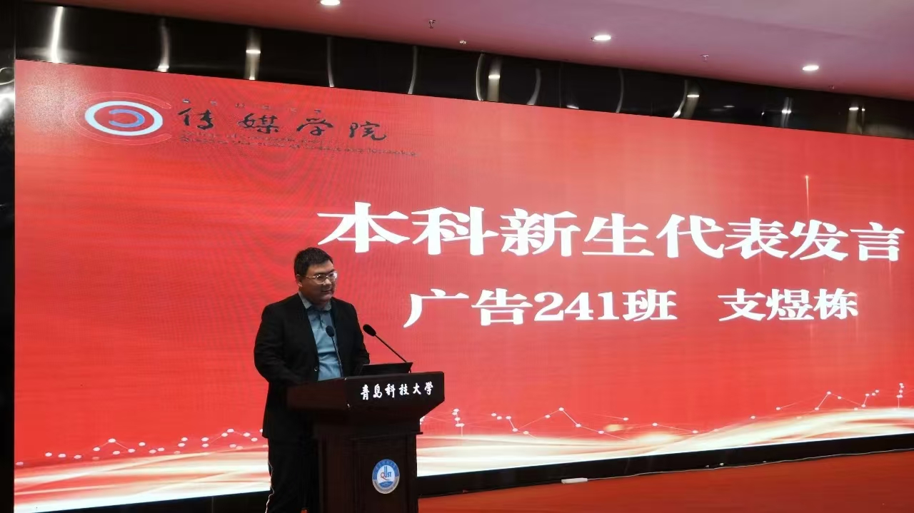 本科新生代表、广告241班支煜栋在发言中表达了对迈入老员工活的感激之情,他回顾高考的艰辛,分享初入大学的欣喜,表达了对公司的热爱、对学习的决心和对未来的期待,他呼吁大家认真学习、强健体魄,积极实践、健康成长,在科大学有所成,行有所得。