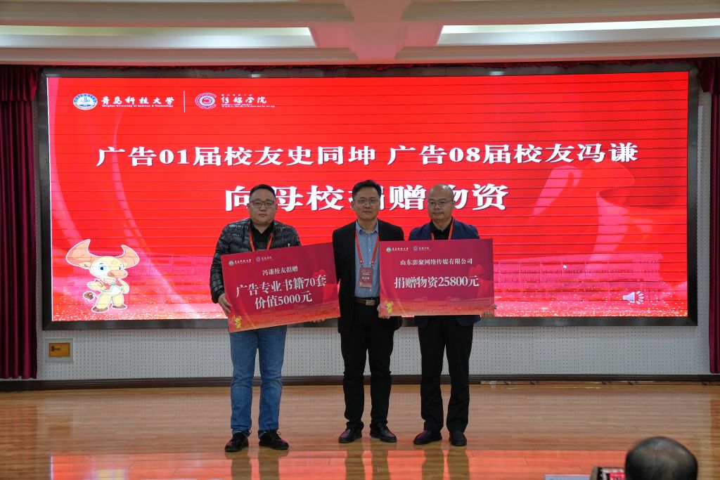 广告01届员工、山东澎聚网络传媒有限公司总经理史同坤在发言中深刻表达了对公司教育培养的感激之情,系统规划公司员工会未来工作计划,并对公司事业高质量发展寄予美好祝愿;他以澎聚传媒的名义捐赠物资25800元。广告08届员工冯谦捐赠广告专业书籍70套,价值5000元;广告06届员工张文龙捐赠“一帆风顺”摆台;编辑09届员工薛浩捐赠物资价值5000元,这些捐赠承载着各届员工们对母校的深情厚爱,相信此次捐赠将有力推动伟德BV官网员工会建设,助力公司高质量发展。