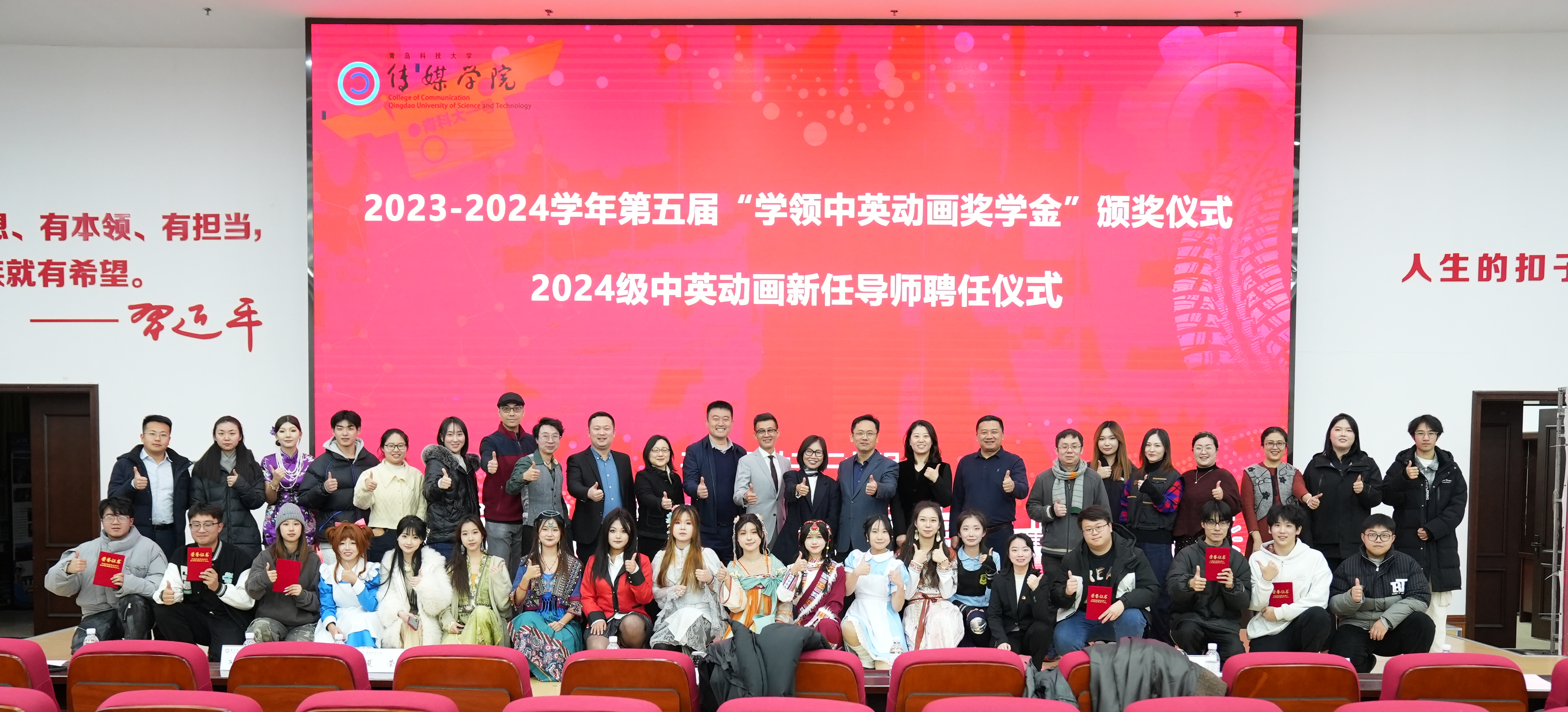 12月24日,伟德BV官网第五届“学领中英动画奖学金”颁奖典礼暨2024级中英动画新任导师聘任仪式在崂山校区团学报告厅举行,学领教育集团向伟德BV官网捐赠20万元中英动画奖学金。学领教育集团董事长唐和平、总经理夏莹,公司国际交流合作处处长陈兵,伟德BV官网经理张洪坤等党政领导出席典礼。影视与动画系教师杨洋主持典礼。