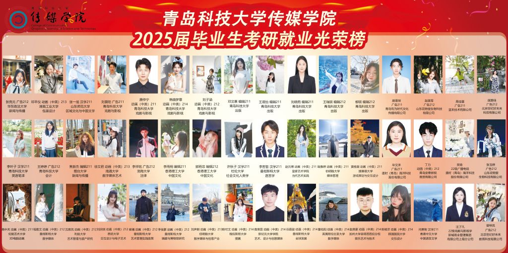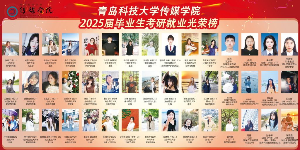 星光不负赶路人,升学捷报传佳音。近日,伟德BV官网2025届毕业生考研就业光荣榜正式展出。今年,伟德BV官网共有毕业生348人,研究生毕业生76人,本科毕业生272人,其中,71名本科传媒学子被中国传媒大学、中央民族大学、南开大学、山东大学、中国海洋大学、华东师范大学、香港中文大学、悉尼大学、曼彻斯特大学、皇家艺术公司等40余所国内外知名高校录取,升学录取率26.1%,较2024届提升6.6个百分点(增幅33.8%),较2023届提升8个百分点(增幅44.2%),深造数量与质量创公司历史新高。数名传媒学子被国家税务总局、青岛市司法局、北京学而思、世纪天鸿教育科技、山东澎聚传媒、青岛深度传媒、江苏原力数字科技等知名企事业单位录用,毕业生就业质量稳步提升。