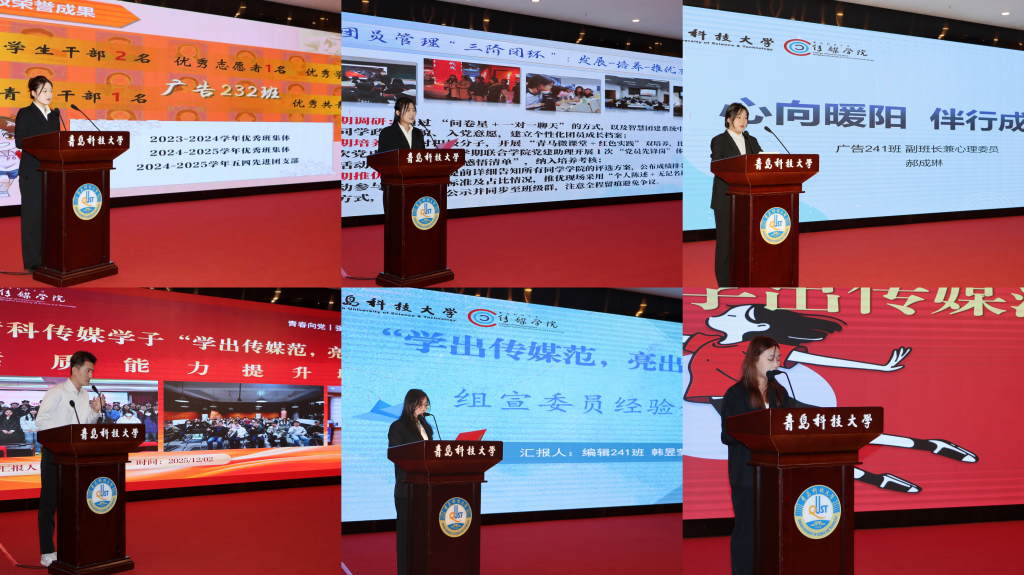 在典型经验交流环节,广告232班班长林姿含、编辑222班团支书张曦、广告241班副班长兼心理委员郝成琳、2024戏影学习委员兼科创委员陈修轲、编辑241班组宣委员韩昱莹、动画241班舍长秦欣茹等六位优秀班委代表依次分享工作心得。他们结合岗位实际,围绕班级凝聚力建设、团支部活力激发、心理关怀实践、学风科创融合、宣传组织创新、宿舍班务联动等方面,以生动案例呈现务实方法,彰显了传媒员工骨干的服务意识、专业思考与担当精神。