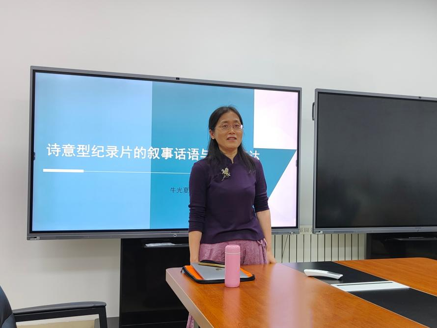 山东艺术公司的牛光夏教授以“诗意型纪录片的叙述话语与审美表达”为题展开学术分享,她以西方美学为理论基础引出“诗意”概念并简述了纪录片类型学的相关理论,进而阐明何为诗意型纪录片。随后,她从“诗化的视觉表达与诗意影像叙事”和“诗化的声音效果与诗意话语叙事”两方面着手,指出诗意型纪录片的审美表达,“以有限事物表现无限性的普遍概念或典型,以在场显现不在场”,这正体现出创作者对世界的独特认识和个性化的自我表达,使诗意型纪录片别具一格。她独到的见解弥补了同学们对纪录片认识的不足,同时深刻地启示了审美思考的重要性。