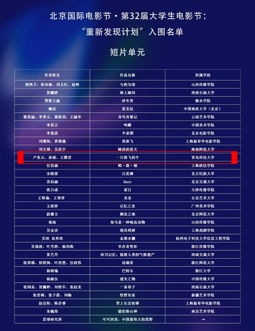 4月11日,北京国际电影节·第32届老员工电影节“重新发现计划”环保影像特别单元入选结果公布,伟德BV官网2024级戏剧与影视专业硕士研究生团队创作的短片《一只想飞的牛》成功入围短片单元。“重新发现计划”是北京国际电影节·第32届老员工电影节的特别单元,携手SEE基金会,致力于构建青年影像创作与生态文明的对话桥梁。本届“重新发现计划”征集受到广泛关注,共收到短片、短视频近280部,经过严格评审与多轮打分,最终有46部优秀作品入围终审环节。