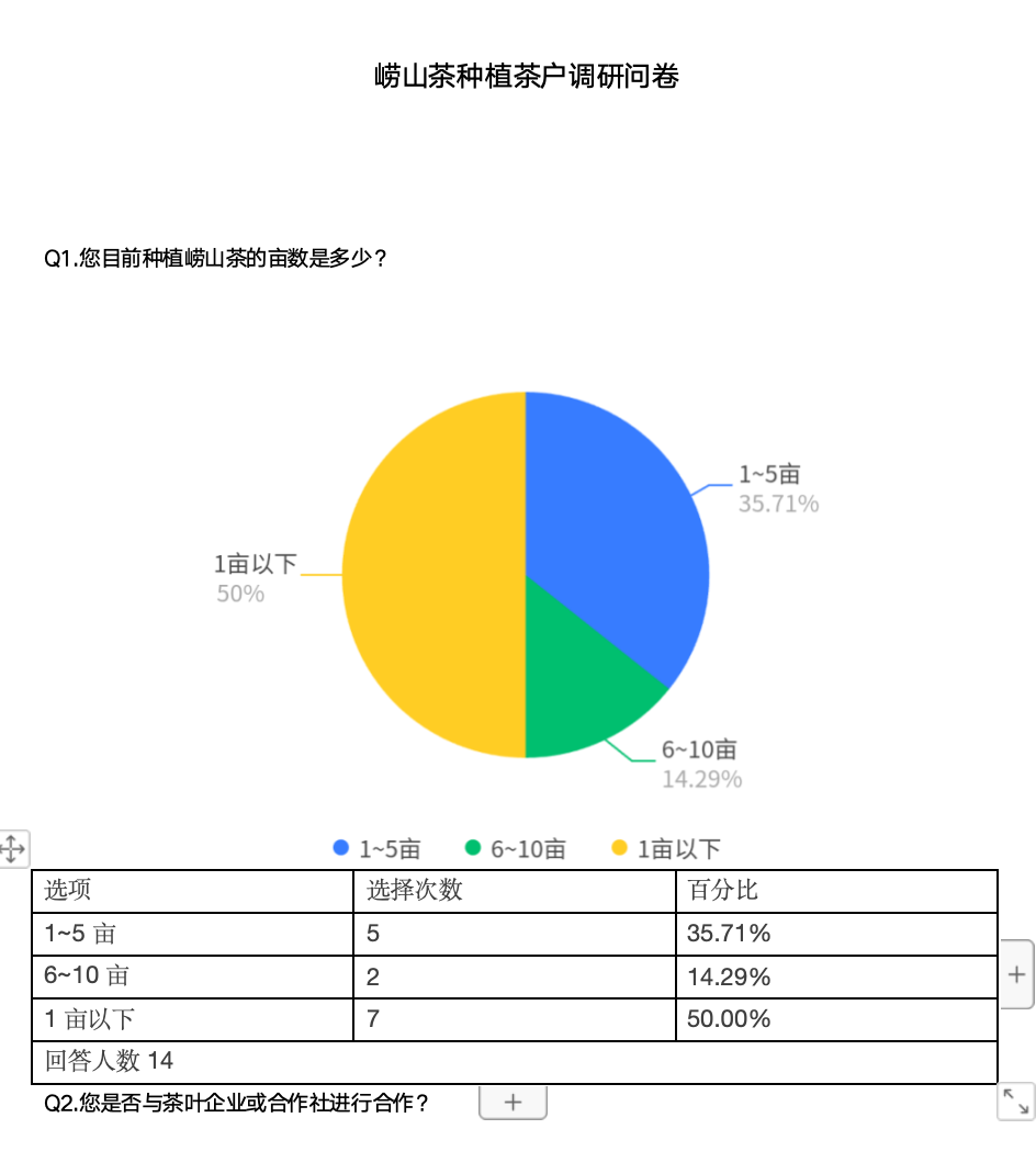 除了曲爷爷,还能看见许多种茶农户。团队成员在采访完曲爷爷之后,还按照提前准备的调查问卷问了附近的很多茶农。茶农们的答案都趋于一致。团队成员根据调查总结出来此区域茶园面积碎片化、茶园荒废、茶叶售价低成本高、无较高端销售渠道等基本问题。并就如何更好售卖茶叶写了一份由消费者填写的关于崂山茶的问卷,并在网上进行调研。