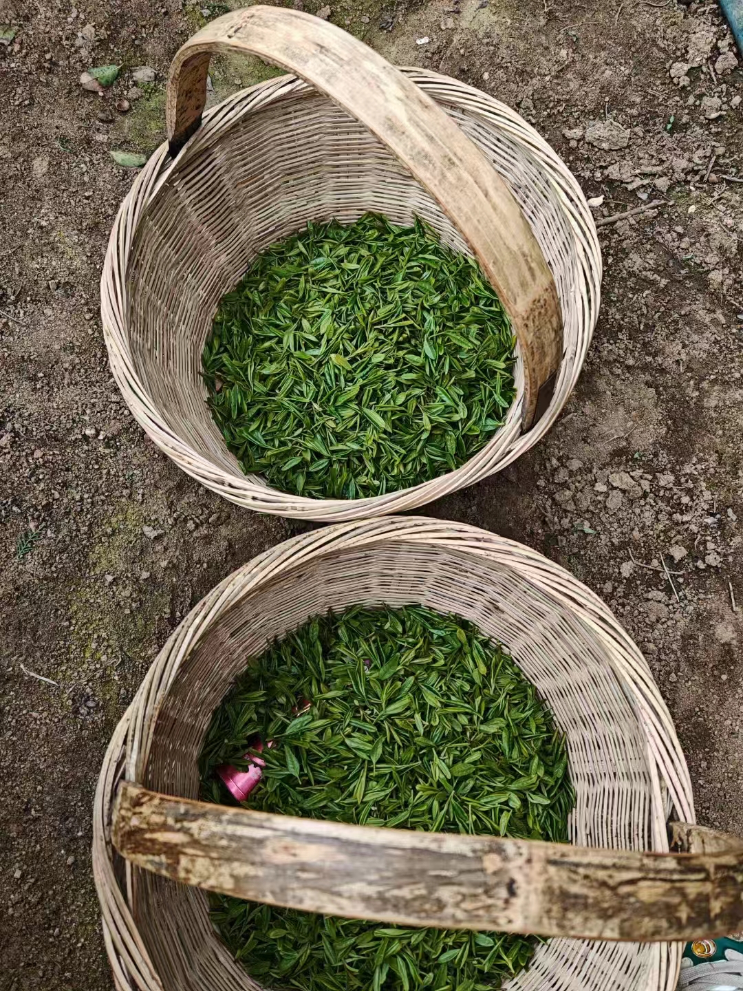 曲爷爷给团队成员分发了小篮子,并告诉团队成员采茶的口诀——两叶一芽长适中。听完采摘方法的团队成员都觉得十分容易,迫不及待地干了起来。一个个嫩芽夹杂在老叶子中间,采摘也需要小心翼翼不能弄碎茶叶,本以为很快干完的事情干了很久。小小的一个小篮子,竟然耗时2个小时才勉强装满。曲爷爷把团队成员采摘的茶叶汇到一个大篮子里,说道:“大家别看现在茶叶很多,等到脱水、加工之后,也就不到二两茶。”看着旁边其他采茶经验丰富的人一个人采集的茶叶快比上了我们一整个队伍采的茶叶,团队成员不由得感叹茶农们的厉害和不容易。曲爷爷自豪地介绍道:“我们这里的茶叶都是天然绿色,用的是大豆肥、手工采摘、手工制作,每一片茶叶的制作都不容易。想要好茶,就要不容易一些嘞。”