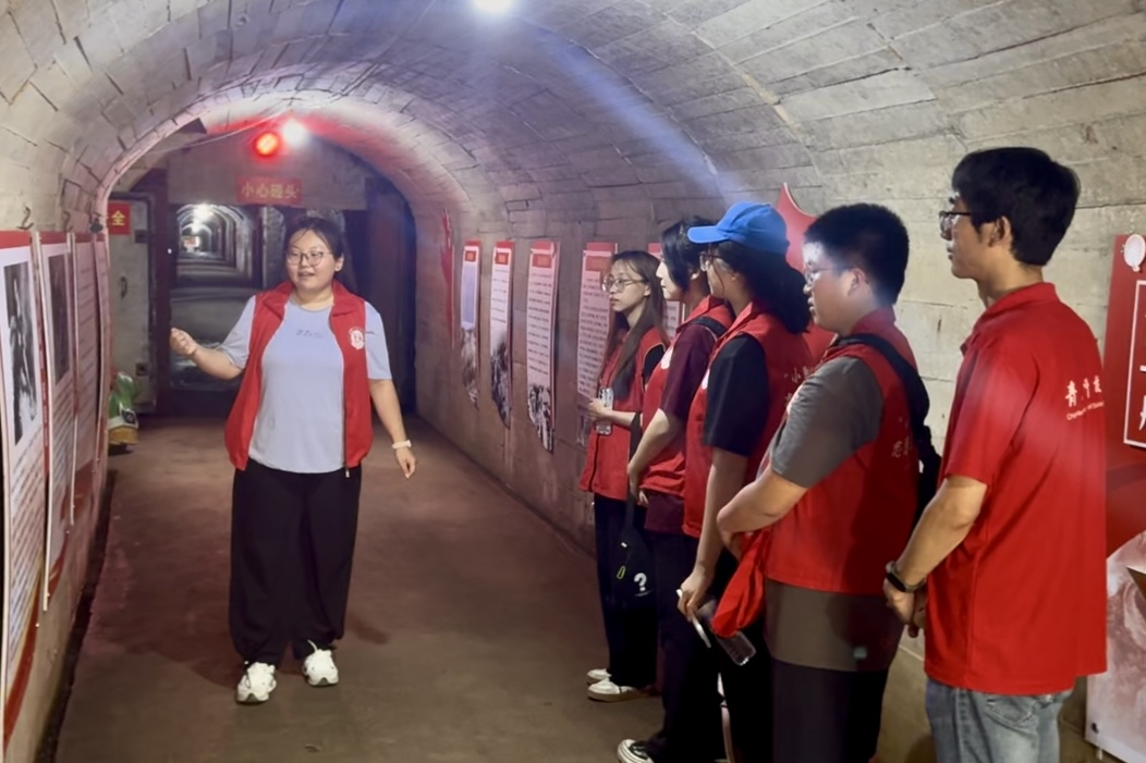 当实践团队员们走进防空洞,历史便映入眼帘。洞壁上的图片和故事配上同学们生动的讲解,丹山战役就不仅仅是存在于课本中苍白的四个字,而是有血有肉的英雄铸就的不朽的红色传奇。侦察员王嘉祥乔装长工卧底侦查敌情、连指导员雷风春舍身救乡亲、女战士徐玉珠敌堡前救伤员、小战士张克信冒死炸暗堡……看到这些与自己同龄的战士们的革命事迹,队员们深受触动:我们处在同样的青春坐标,但因为时代不同而有了不同的青春命题。但从这一刻起,传承红色基因不再是抽象口号,而是跨时空的青春对话与时代使命的交接。