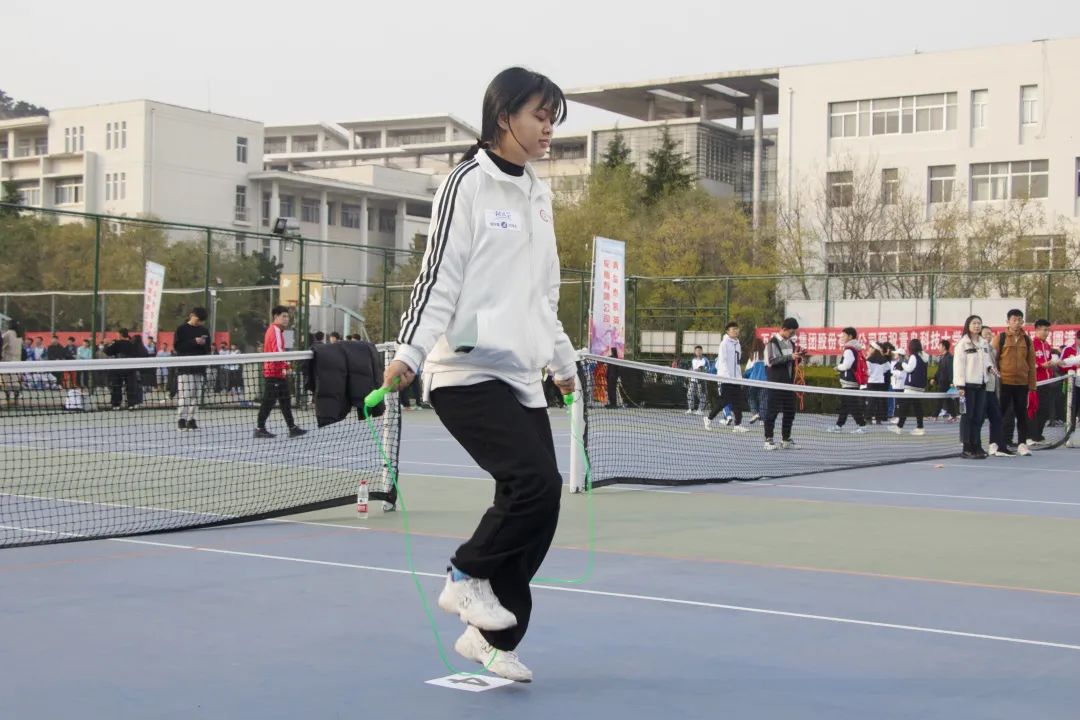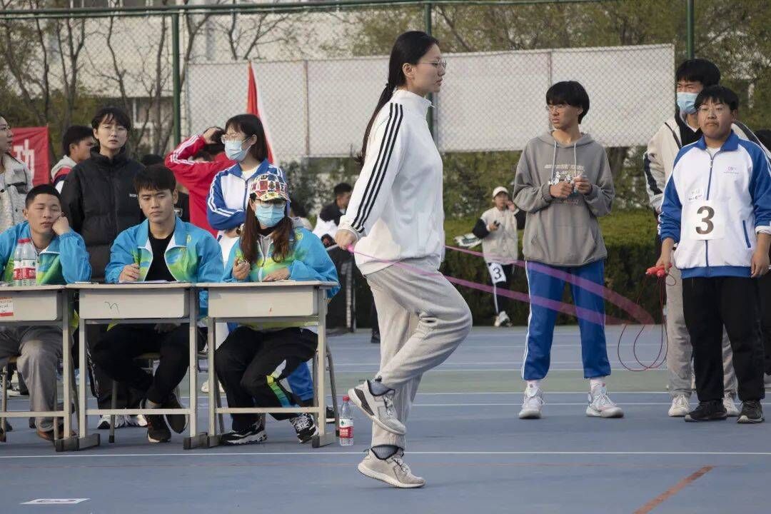 随着一次次起跳又落地,只见参加女子3分钟单摇跳的王家瑶和申紫薇各拿出自己的看家本事,一旁同学们的助威声此起彼伏,为参赛的同学鼓足士气。而参加女子30秒双摇跳的苗茜和李吉烜也不甘示弱,竭尽全力表现出最好的自己。
