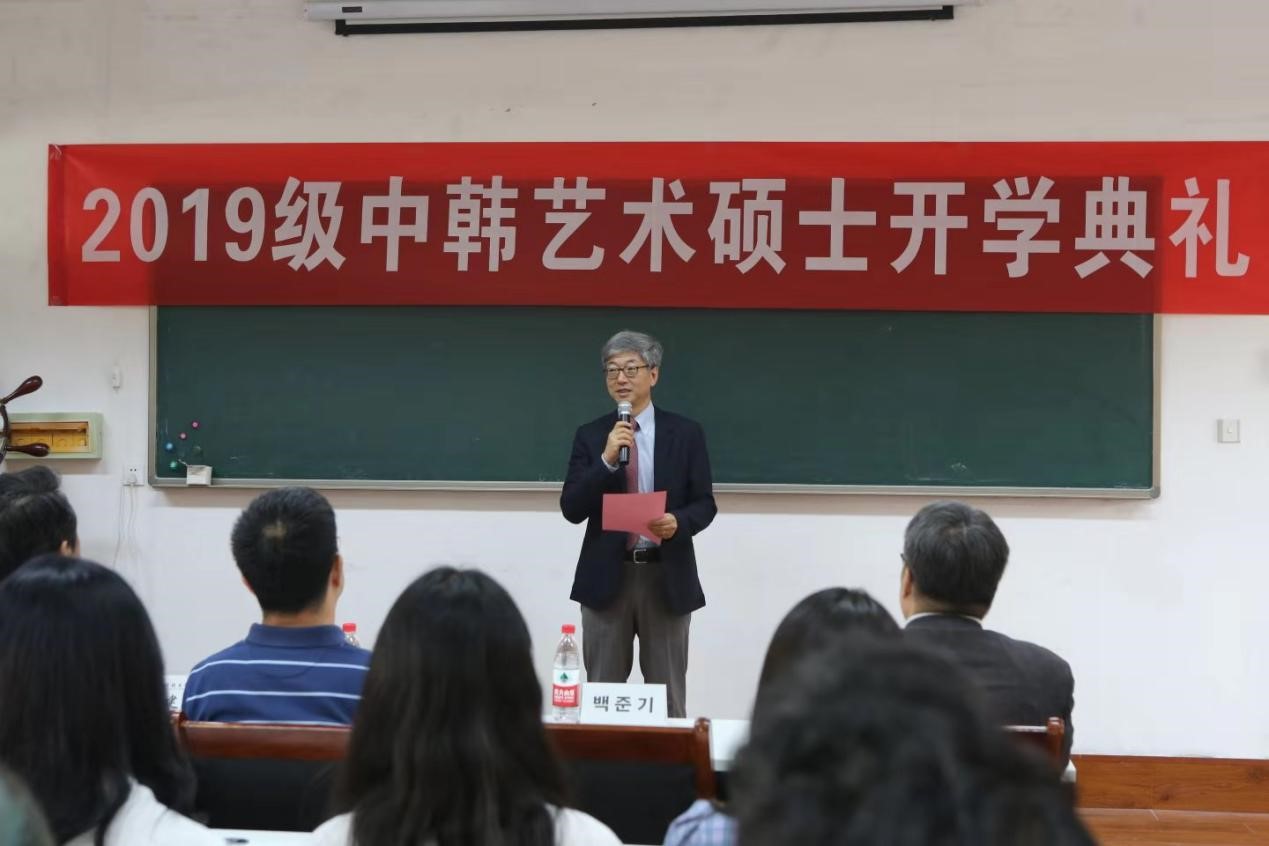 随后,杨建华致辞,他指出,中韩艺术硕士项目有着优质的办学资源、优秀的团队队伍,希望同学们能够珍惜机会,勤奋学习,将来为中韩两国文化艺术交流做出贡献。