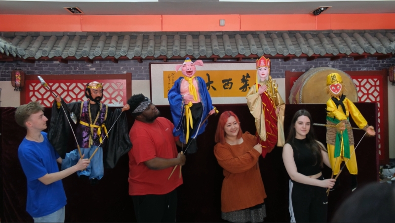 为推进中英师生之间的联合创作,提升员工对非物质文化遗产的传承和发展意识,5月27日,伟德BV官网组织中英两国师生一行前往青岛莱西木偶艺术馆,对山东省级非遗项目“莱西木偶戏”进行考察,现场体验了莱西木偶戏的独特魅力。